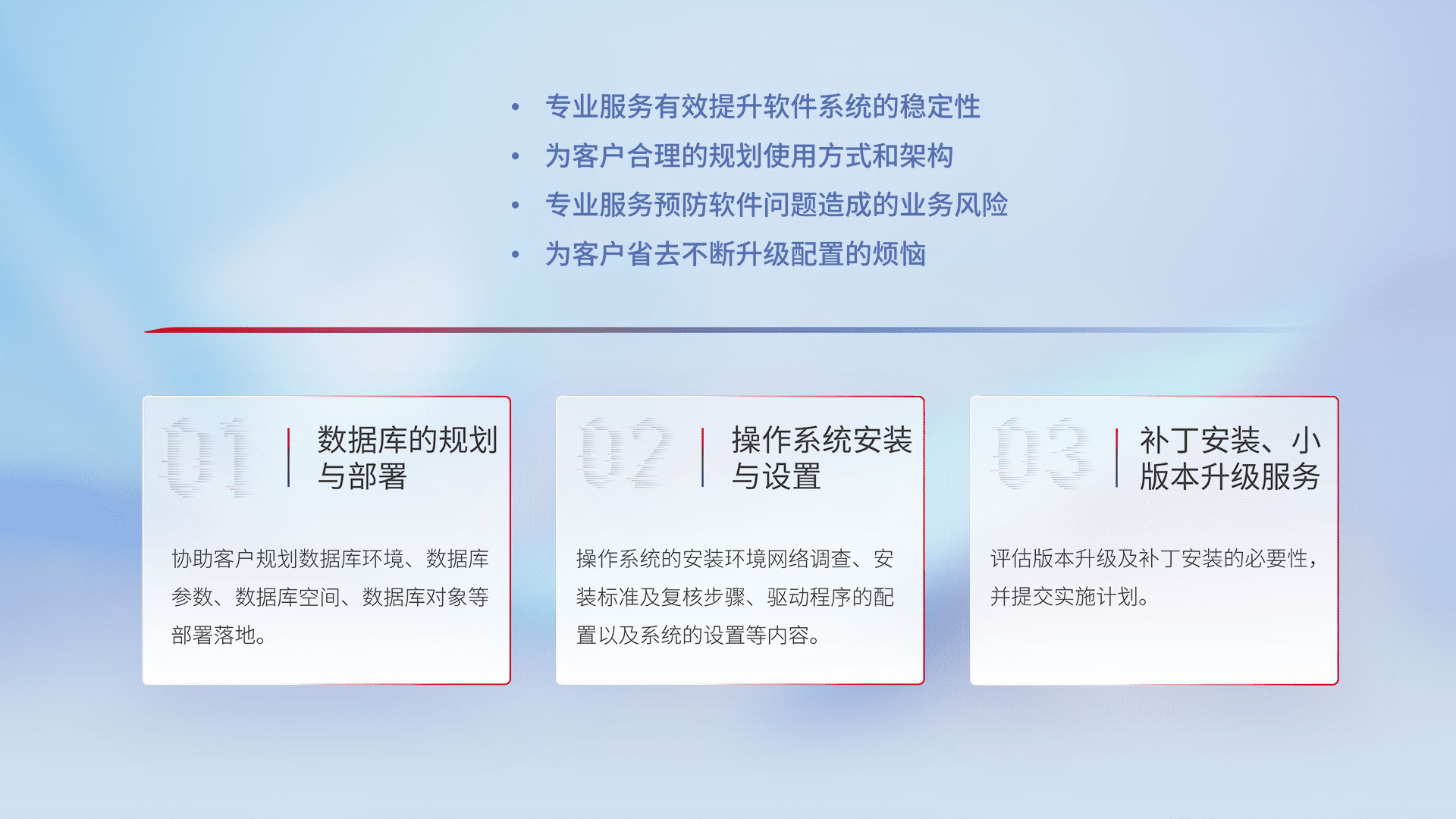 为客户提供软件规模升级、、快速部署、、、按需配置的专业服务,,从数据库的规划与部署到操作系统的安装与设置,,,,再到补丁安装和小版本升级提供支持。。